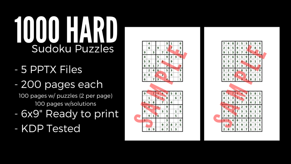 1000 HARD Sudoku Puzzle 6x9" - 5 PPTX Files Customizable